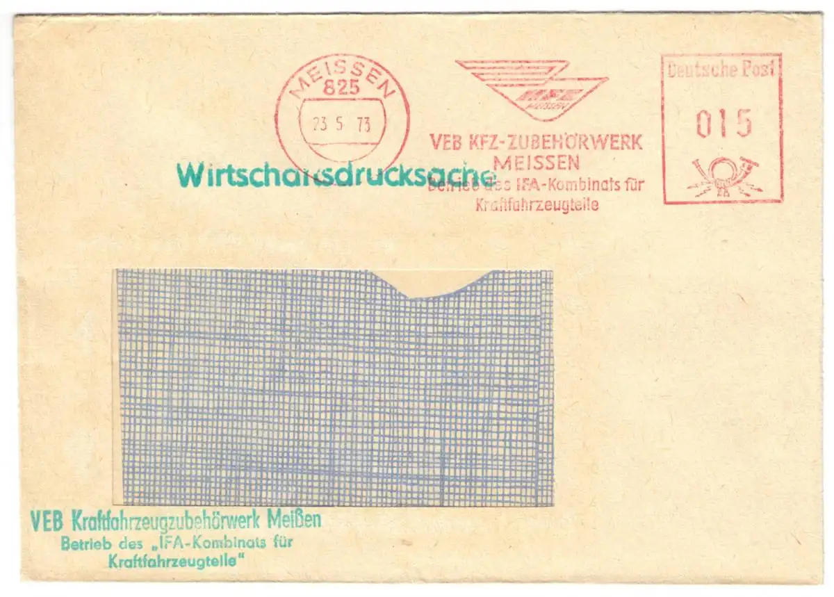 AbsenderfreistempelVEB Kfz-Zubehörwerk Meissen, Betrieb des IFA-Kombinats für Kraftfahrzeugteile Abbildungen: Betriebssignet Absender: VEB Kraftfahrzeugzubehörwerk Meissen, Betrieb des "IFA-Kombinats für Kraftfahrzeugteile" Empfänger: unbekannt, FensterbriefPorto: 015 Nebenstempel: Wirtschaftsdrucksache Anmerkungen: keine Im Inland erfolgt die Zusendung versandkostenfrei als Briefsendung der Deutschen Post AG oder eines privaten Postanbieters. Auslandsversand
