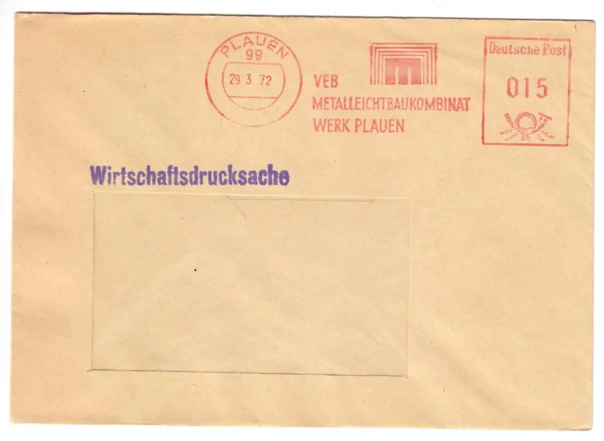 Absenderfreistempel Abbildungen: Betriebssignet Absender: VEB Metalleichtbaukombinat, Werk Plauen Empfänger: unbekannt, Fensterbrief Nebenstempel: Wirtschaftsdrucksache Anmerkungen: keine Im Inland erfolgt die Zusendung versandkostenfrei als Briefsendung der Deutschen Post AG oder eines privaten Postanbieters. Auslandsversand