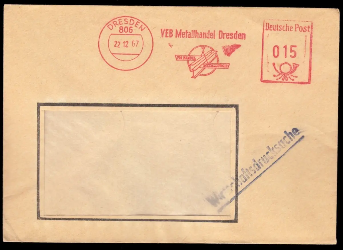 AbsenderfreistempelVEB Metallhandel Dresden Abbildungen: Firmensignet, Stahlprofile Absender: VEB Metallhandel Dresden Empfänger: unbekannt, Fensterbrief Nebenstempel: Wirtschaftsdrucksache Anmerkungen: keine Im Inland erfolgt die Zusendung versandkostenfrei als Briefsendung der Deutschen Post AG oder eines privaten Postanbieters. Auslandsversand erfolgt über