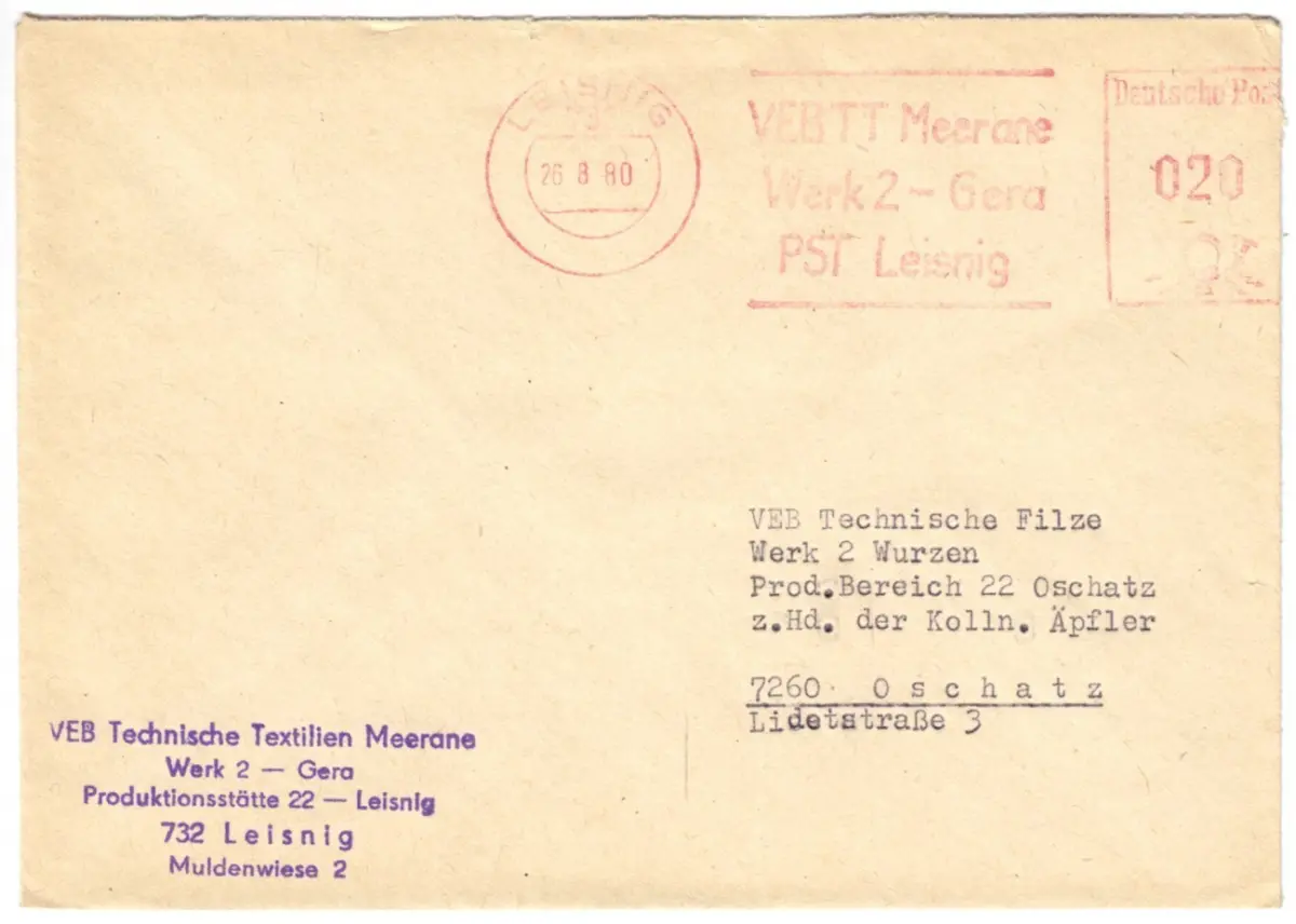 AbsenderfreistempelVEB TT Meerane, Werk 2 - Gera, PST Leisning Abbildungen: keine Absender: VEB Technische Textilien Meerane, Werk 2 - Gera, Produktionsstätte 22 - Leisning, 732 Leisning, Muldenwiese 2 Empfänger: VEB Technische Filze, 7260 Oschatz Nebenstempel: keine Anmerkungen: keine Im Inland erfolgt die Zusendung versandkostenfrei als Briefsendung der Deutschen Post AG oder eines privaten Postanbieters. Auslandsversand erfolgt über