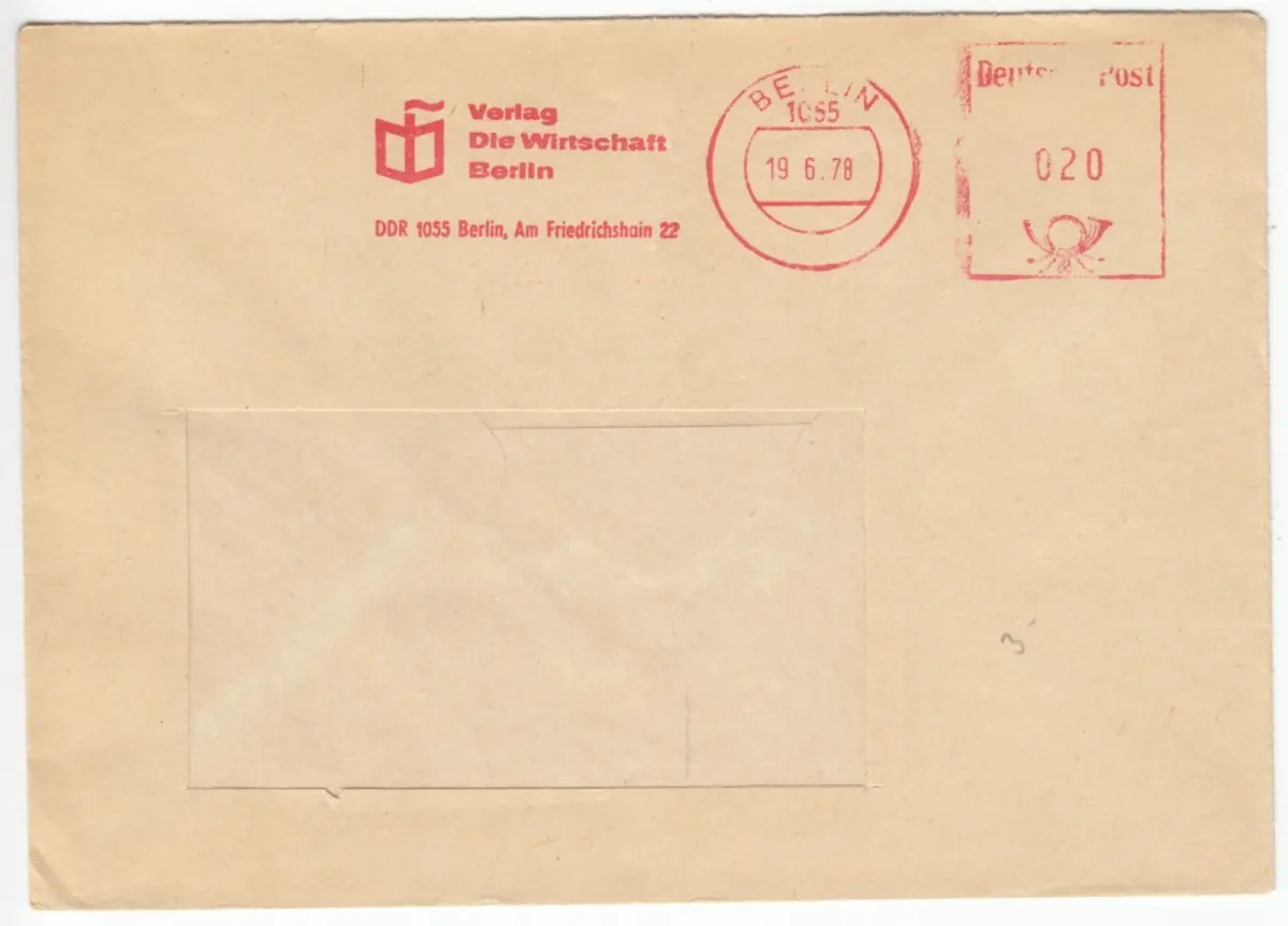 AbsenderfreistempelVerlag die Wirtschaft Berlin, DDR 1055 Berlin, Am Friedrichshain 22 Abbildungen: Verlagssignet Absender rückseitg: Verlag die Wirtschaft, Redaktion Gastronomie, 1055 Berlin, Am Friedrichshain 22 Empfänger: unbekannt, Fensterbrief Nebenstempel: keine Anmerkungen: keine Im Inland erfolgt die Zusendung versandkostenfrei als Briefsendung der Deutschen Post AG oder eines privaten Postanbieters. Auslandsversand erfolgt über