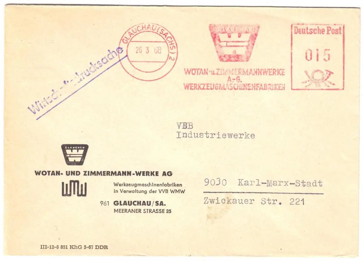 Absender: Wotan- u. Zimmermann-Werke A.-G.,Werkzeugmaschinenfabriken in Verwaltung der VVB WMW, 961 Glauchau, Meeraner Str. 25
