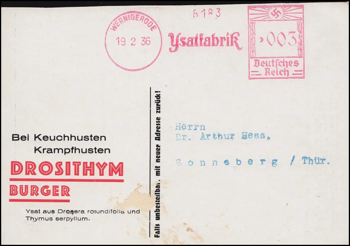 AFS Ysatfabrik Johannes Bürger Keuchhusten / Krampfhusten WERNIGERODE 19.2.1936