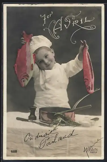 AK 1. April, Kleiner Koch mit Fischen in den Händen