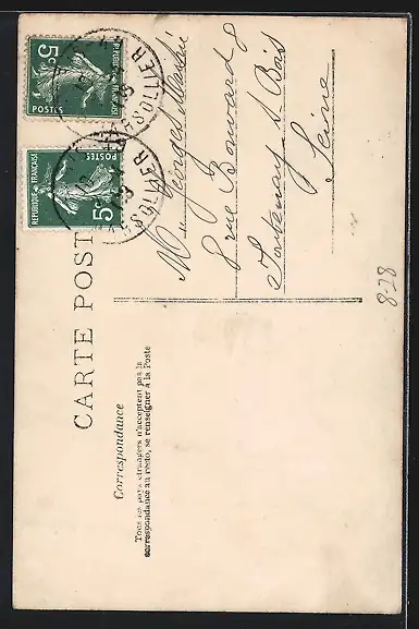 Personenbezogene Daten auf der Rückseite der Karte wurden durch blauen Textmarker unkenntlich gemacht. Die blauen Stellen sind auf die Vorderseite durchgeweicht und wirken sich negativ auf das Postkartenfoto aus