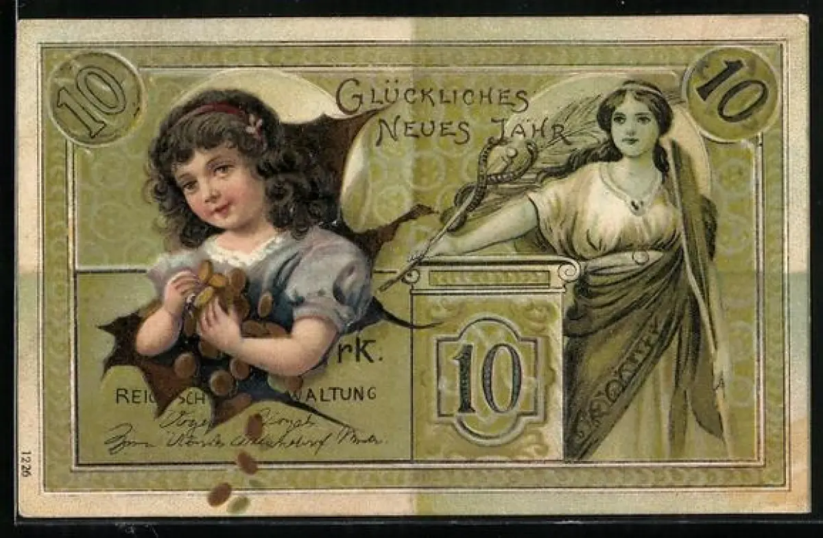 AK 10 Mark Schein, Mädchen mit Geldmünzen, Frau mit Schlangenstab, Prosit Neujahr