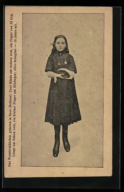 AK 16-jähriges Wundermädchen, zwei Hände am rechten Arm, ein Finger von 35 cm