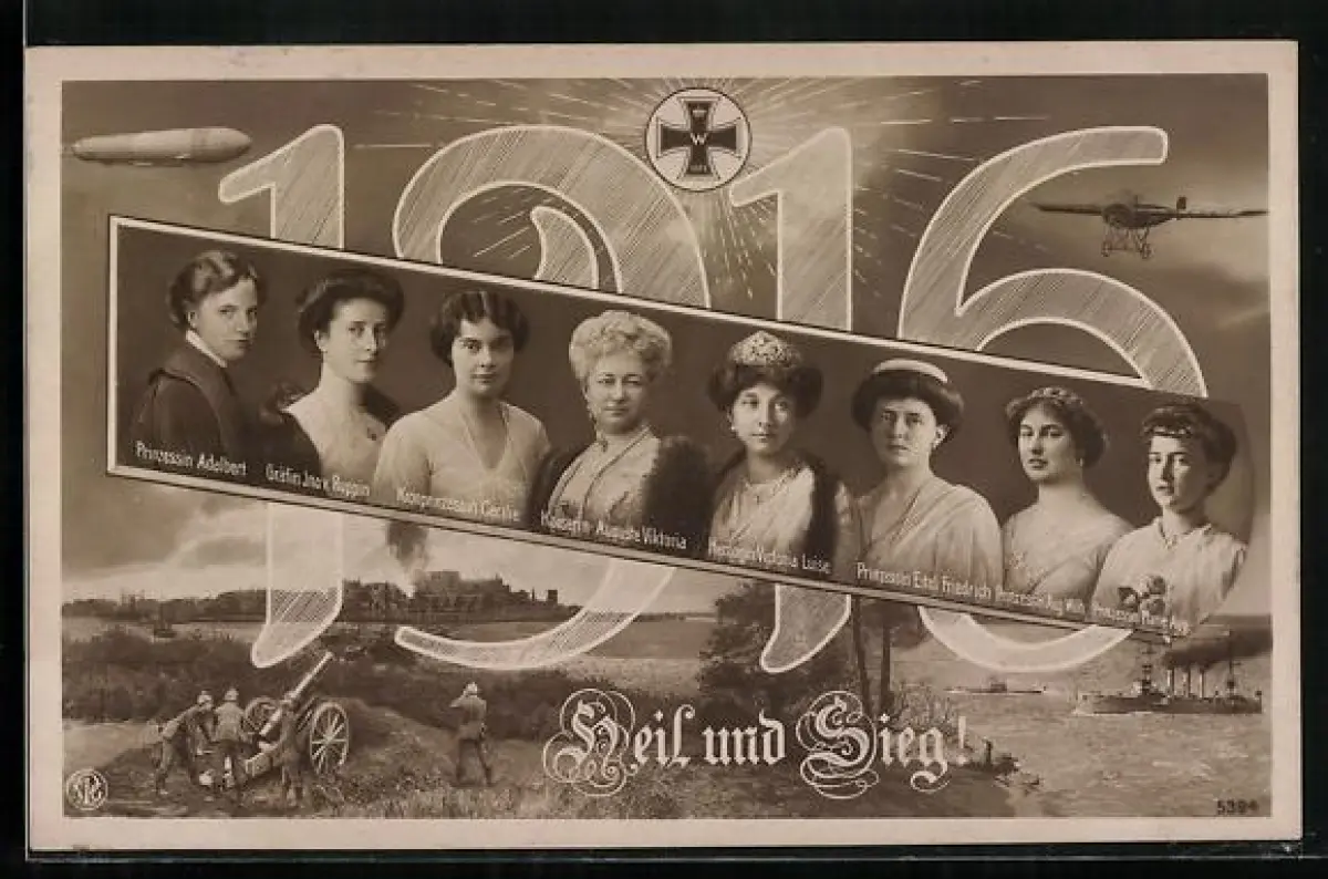 AK 1916, Kaiserin Auguste Victoria Königin von Preussen und Prinzessinnen, Montage mit Zeppelin, Flugzeug und Kanone