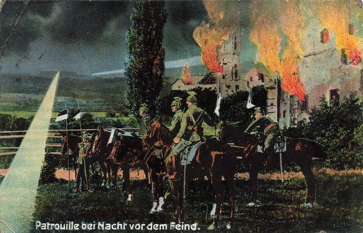 AK 1.WK Ulanen Patrouille bei Nacht vor dem Feind 1915 gelaufen Patriotika