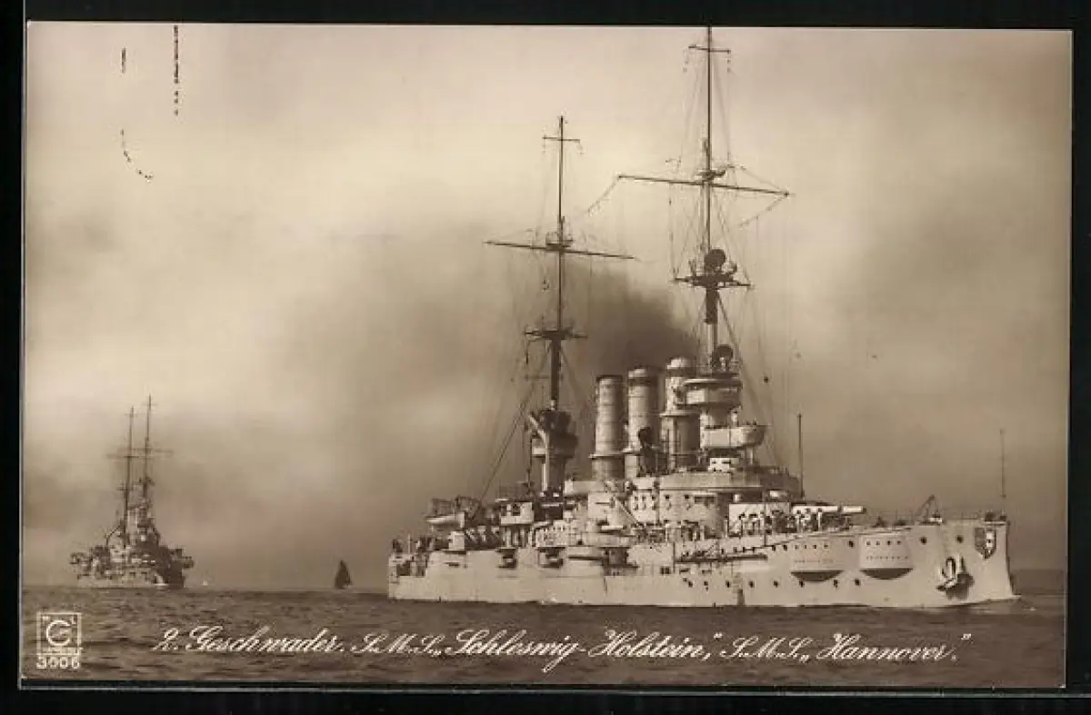 AK 2. Geschwader, Kriegsschiffe SMS Schleswig-Holstein und SMS Hannover zur See stechend