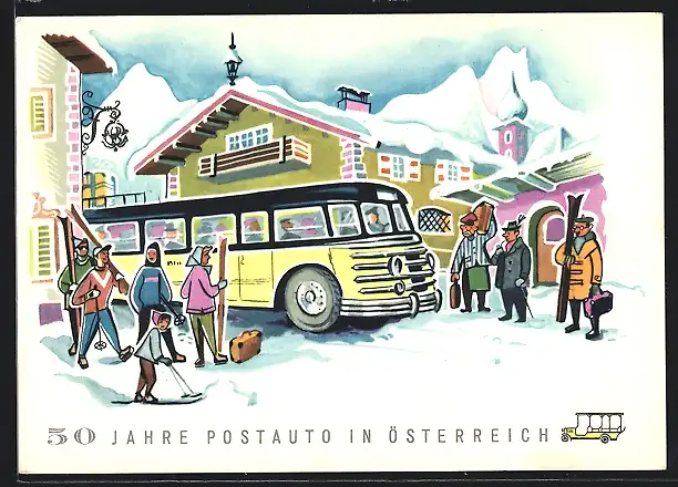 AK 50 Jahre Postauto in Österreich, Postbus und Skitouristen