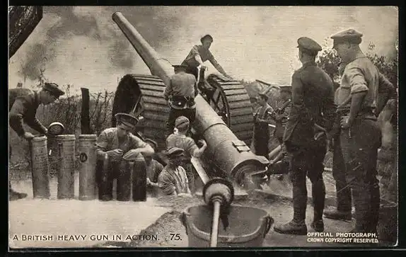 AK A British heavy Gun in action, Britische Soldaten in Uniform mit Kanone