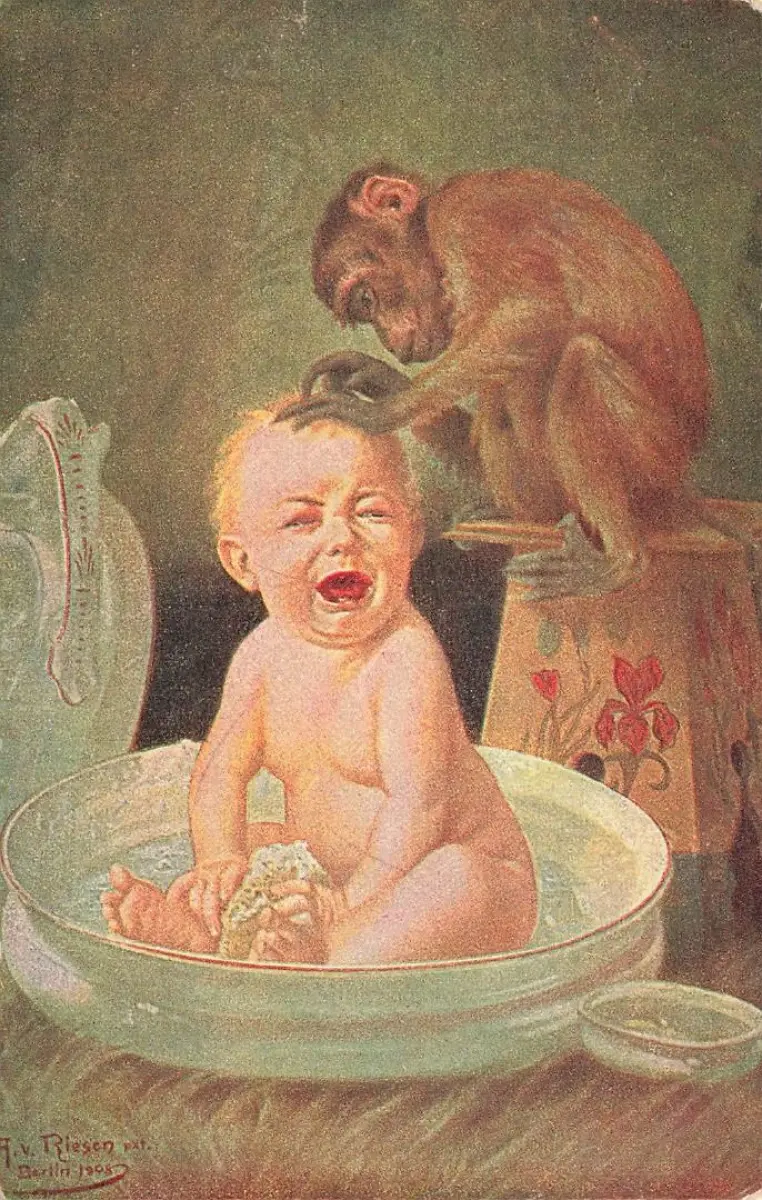 AK A. Riesen Affe laust weinendes Baby in Waschschüssel 1918 gelaufen Feldpost