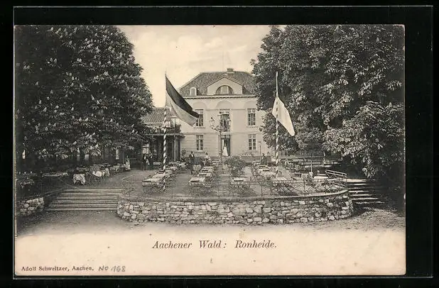 AK Aachen, Gasthaus Ronheide im Aachener Wald, Gebäudeansicht mit Terrasse