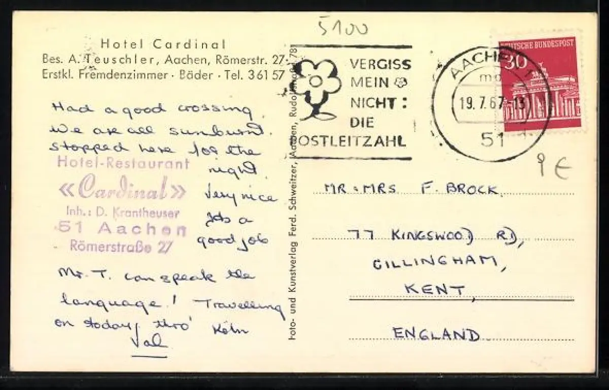 AK Aachen, Interieur Hotel Cardinal in der Römerstrasse 27, Bes. A. Teuschler