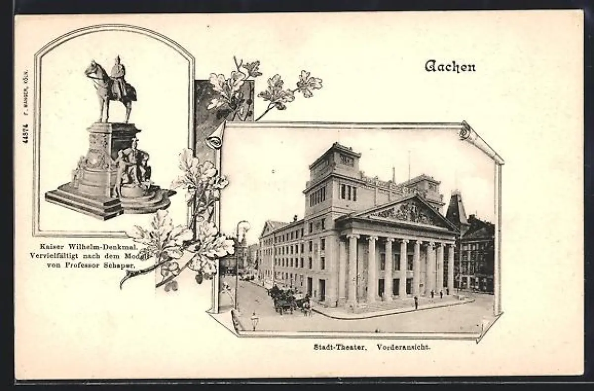 AK Aachen, Kaiser Wilhelm-Denkmal und Vorderansicht des Stadt-Theaters