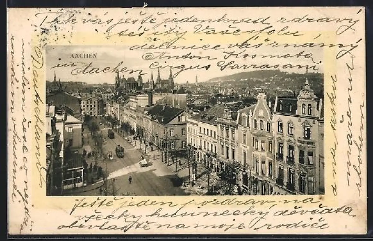 AK Aachen, Strassenpartie mit Fernblick auf den Aachener Dom, Strassenbahn