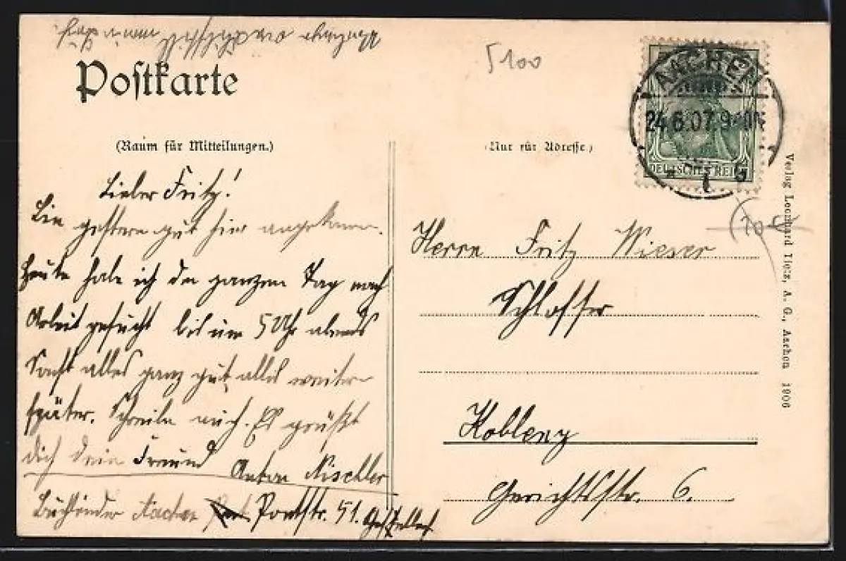 alte Ansichtskarte, gelaufen 1907, Stempelspur, guter Zustand
