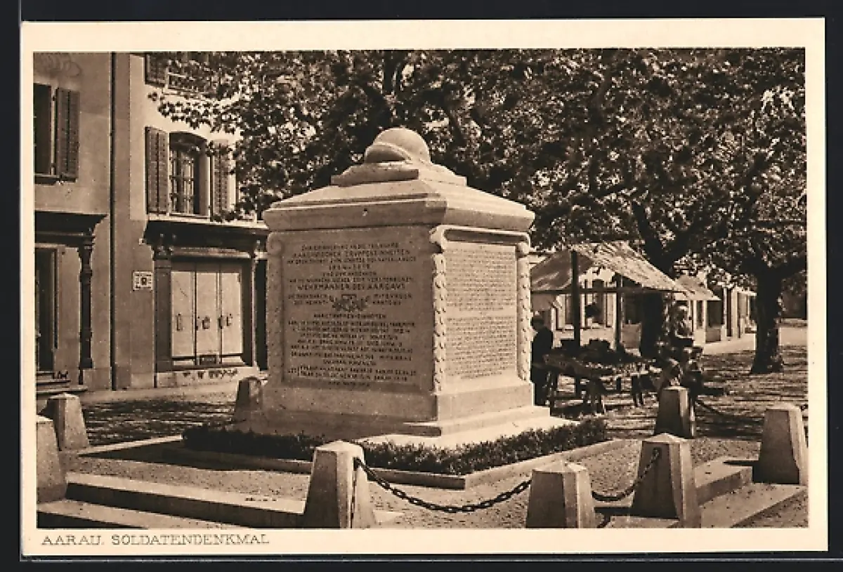 AK Aarau, Soldatendenkmal, Obst- und Gemüse Marktstand im Hintergrund