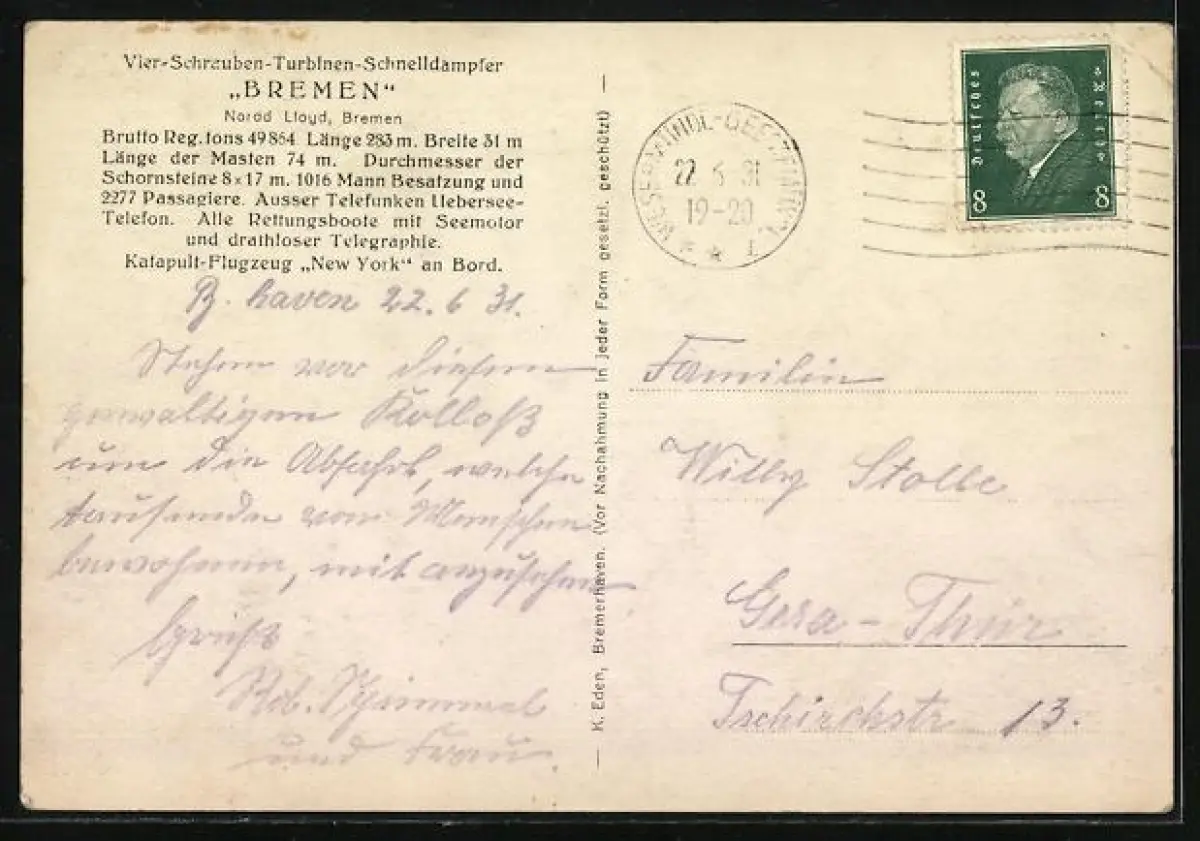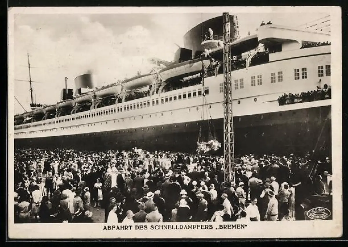 AK Abfahrt des Schnelldampfers Bremen des Norddeutschen Lloyd, Passagierschiff