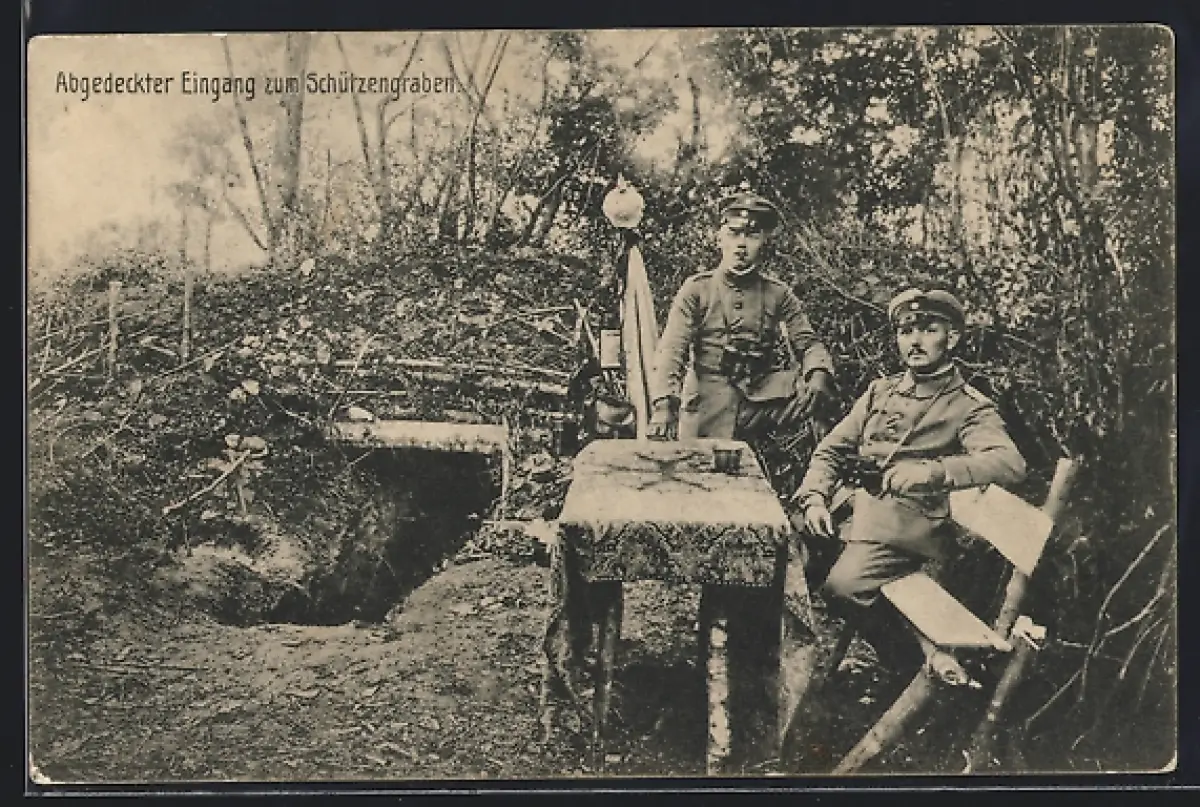 AK Abgedeckter Eingang zum Schützengraben, Offiziere mit Feldstecher