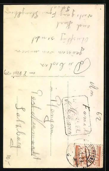 Personenbezogene Daten auf der Rückseite der Karte wurden durch blauen Textmarker unkenntlich gemacht. Die blauen Stellen sind auf die Vorderseite durchgeweicht und wirken sich negativ auf das Postkartenfoto aus