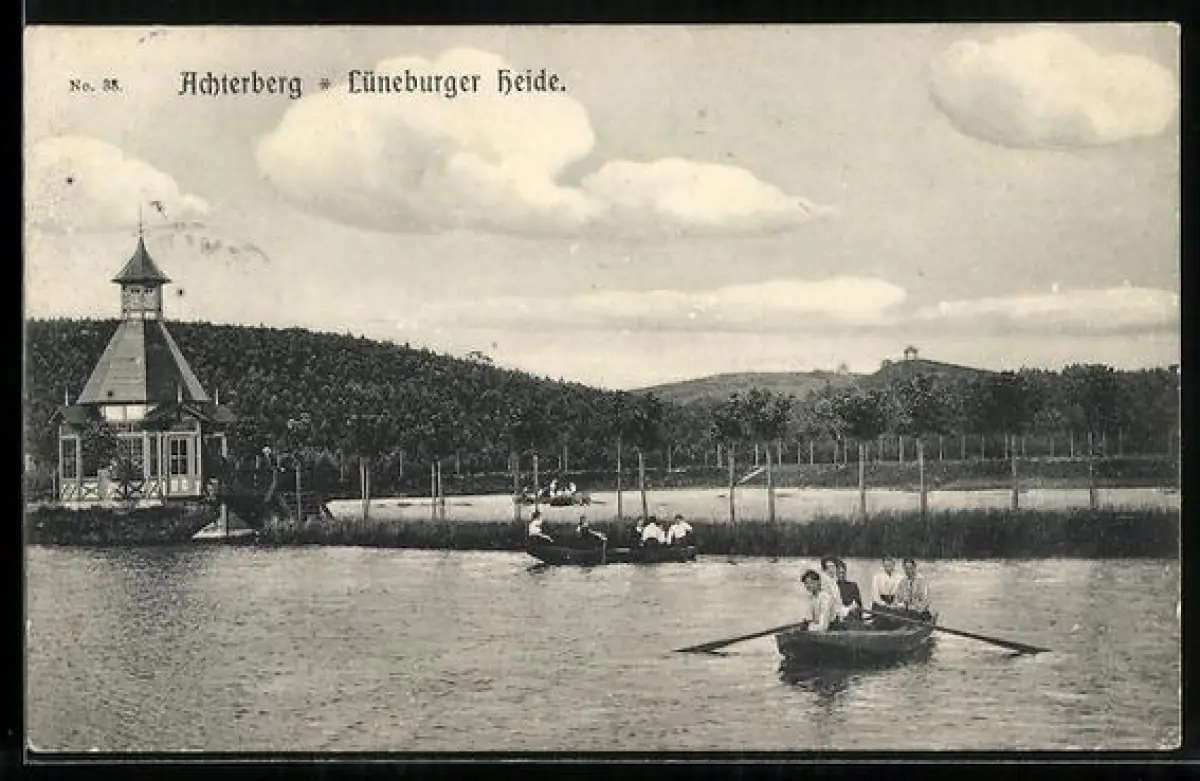 AK Achterberg / Lüneburger Heide, Wasserpartie mit Ruderern und Pavillon