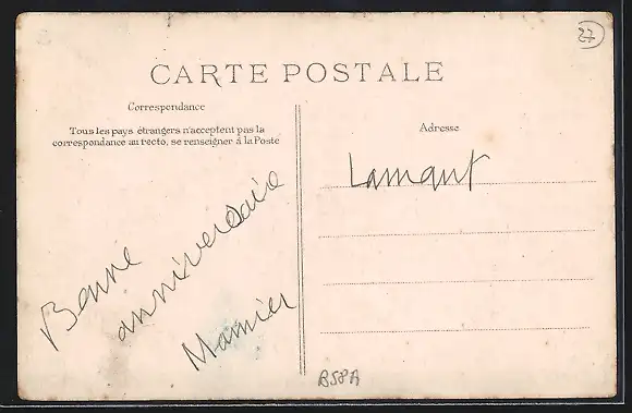 Personenbezogene Daten auf der Rückseite der Karte wurden durch blauen Textmarker unkenntlich gemacht. Die blauen Stellen sind auf die Vorderseite durchgeweicht und wirken sich negativ auf das Postkartenfoto aus