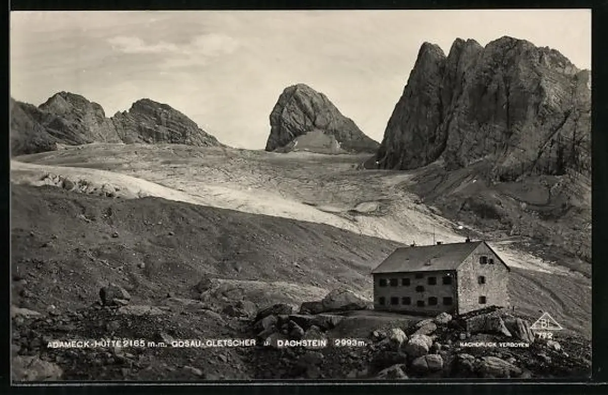 AK Adamek-Hütte mit Gosaugletscher und Dachstein, Aussenansicht der Berghütte