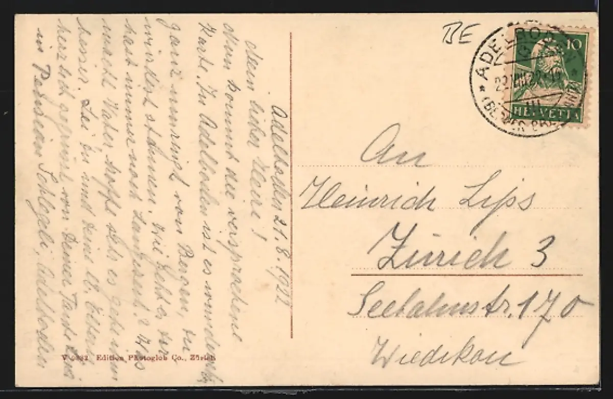 Personenbezogene Daten auf der Rückseite der Karte wurden durch blauen Textmarker unkenntlich gemacht. Die blauen Stellen sind auf die Vorderseite durchgeweicht und wirken sich negativ auf das Postkartenfoto aus