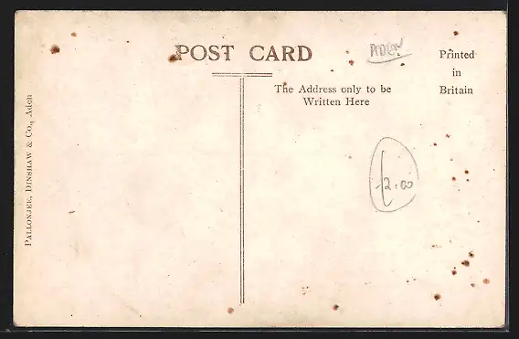 Personenbezogene Daten auf der Rückseite der Karte wurden durch blauen Textmarker unkenntlich gemacht. Die blauen Stellen sind auf die Vorderseite durchgeweicht und wirken sich negativ auf das Postkartenfoto aus