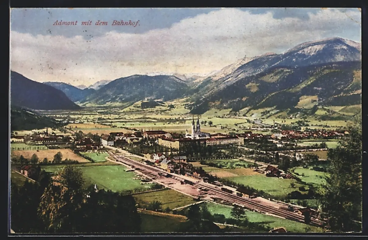 AK Admont, Bahnhof und Teile des Ortes von weitem