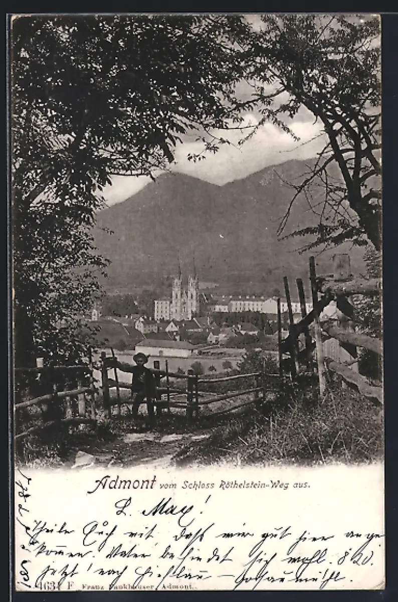 AK Admont, Ortsansicht mit Stiftskirche vom Schloss Röthelstein-Weg aus gesehen