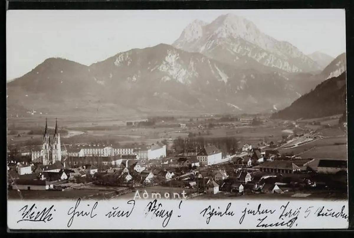 AK Admont, Totalansicht mit Kirche und Bergpanorama aus der Vogelschau