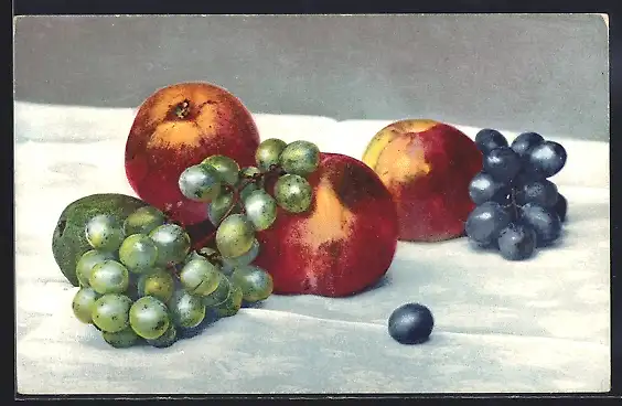 AK Äpfel und Weintrauben auf einer weissen Decke