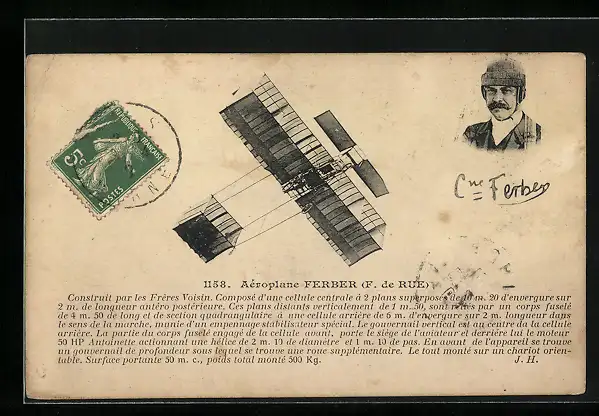 AK Aéroplane Ferber, F. de Rue, Doppeldecker-Flugzeug
