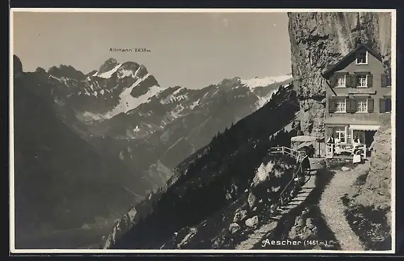 AK Aescher, Gasthaus Aescher Wildkirchl mit Blick auf den Altmann