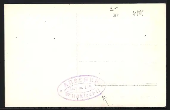 Personenbezogene Daten auf der Rückseite der Karte wurden durch blauen Textmarker unkenntlich gemacht. Die blauen Stellen sind auf die Vorderseite durchgeweicht und wirken sich negativ auf das Postkartenfoto aus