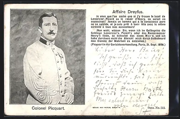 Personenbezogene Daten auf der Rückseite der Karte wurden durch blauen Textmarker unkenntlich gemacht. Die blauen Stellen sind auf die Vorderseite durchgeweicht und wirken sich negativ auf das Postkartenfoto aus