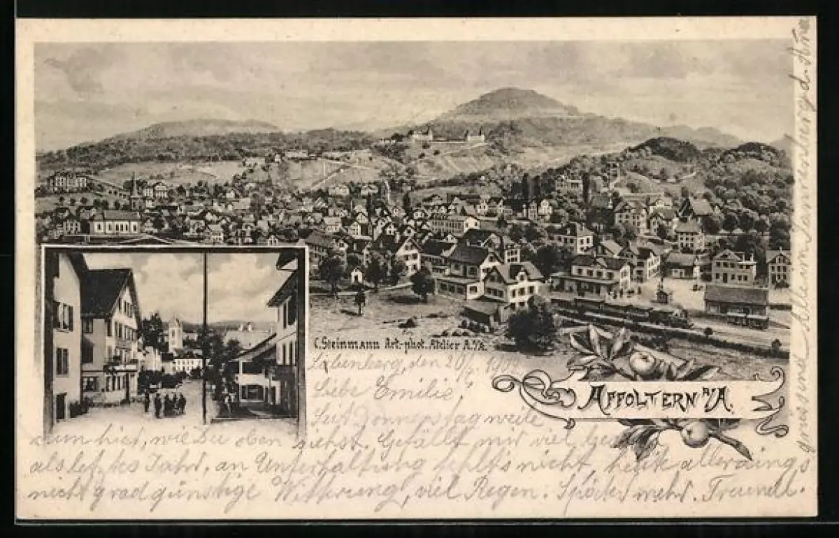 AK Affoltern a. A., Gasthaus im Ort, Ortspanorama mit Bergen