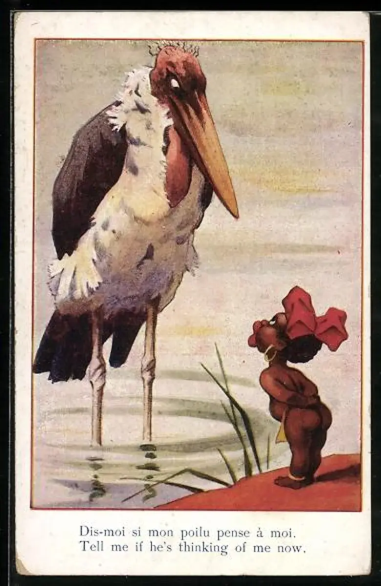 AK Afrikanisches Mädchen trifft Marabu am Wasser