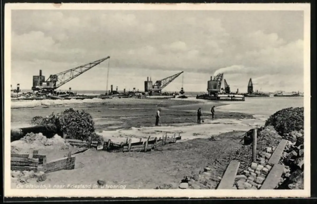 AK Afsluitdijk, Zuiderzeewerken, Strandpartie mit Kränen