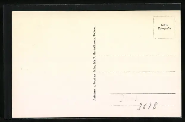 Personenbezogene Daten auf der Rückseite der Karte wurden durch blauen Textmarker unkenntlich gemacht. Die blauen Stellen sind auf die Vorderseite durchgeweicht und wirken sich negativ auf das Postkartenfoto aus