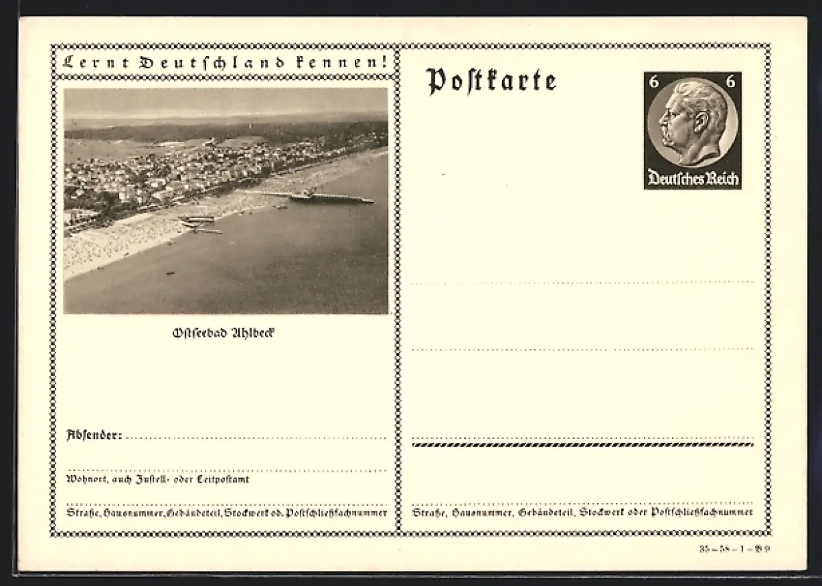 AK Ahlbeck, Strandansicht aus der Luft, Ganzsache Lernt Deutschland kennen