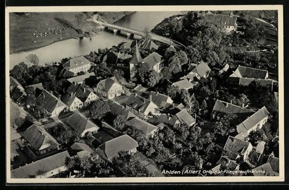 AK Ahlden /Aller, Fliegeraufnahme des Ortes mit Flusspartie und Brücke