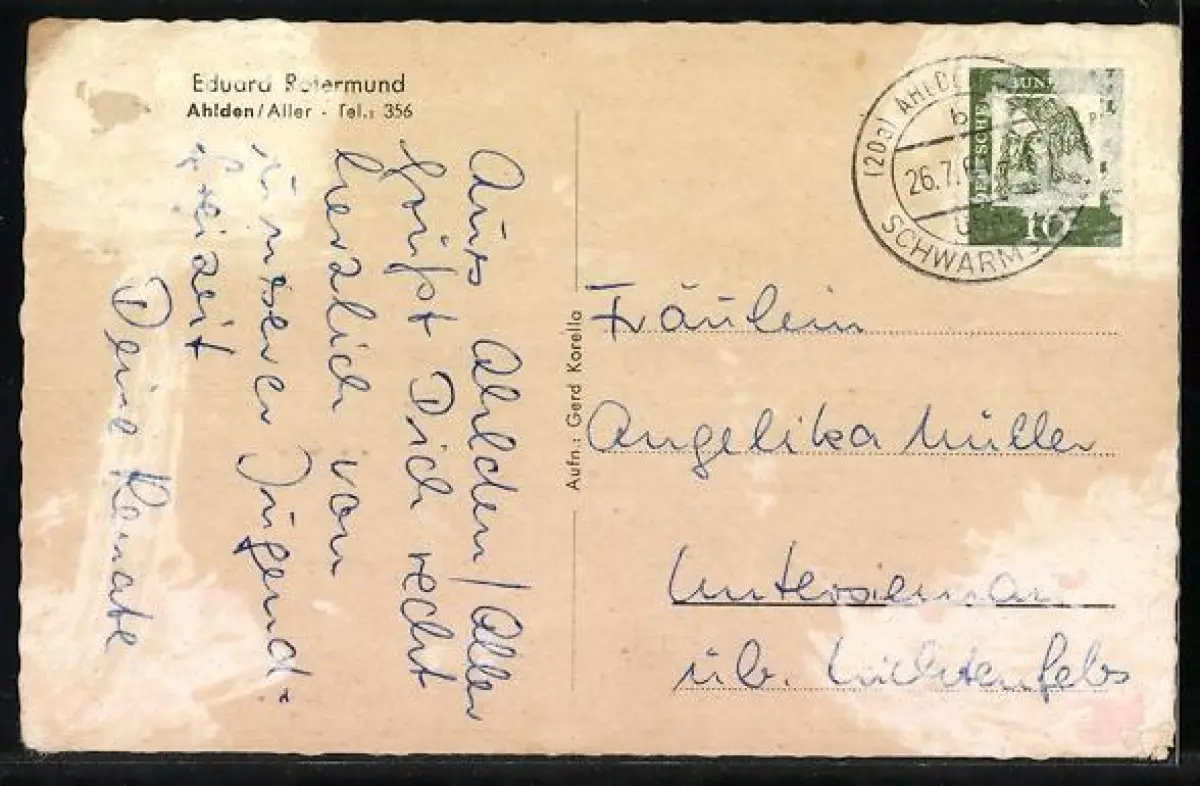 alte Ansichtskarte, gelaufen 1961, Bugspur, Eckknick li. oben, rückseitig Klebe- und Papierreste