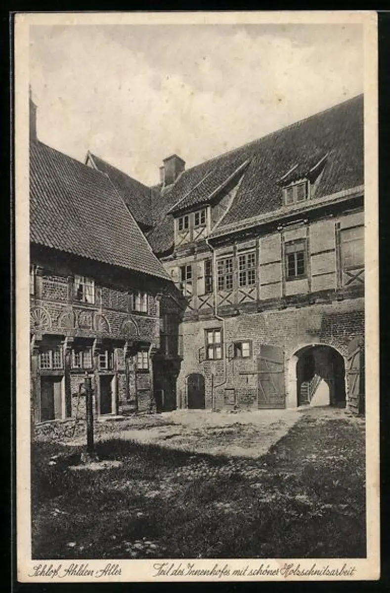 AK Ahlden /Aller, Schloss Ahledn, Teil des Innenhofes mit schöner Holzschnitzarbeit