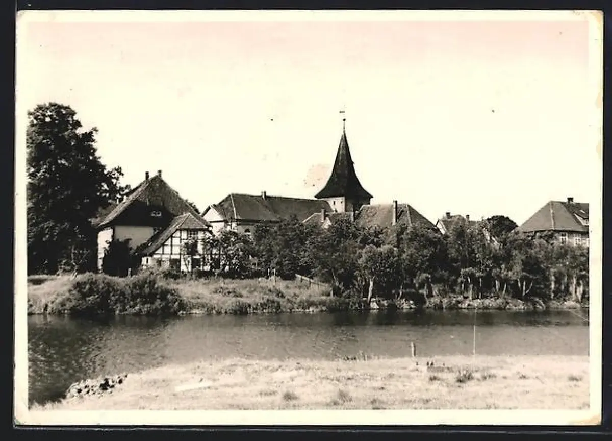 AK Ahlden, Kirche und Fachwerkhaus am Fluss