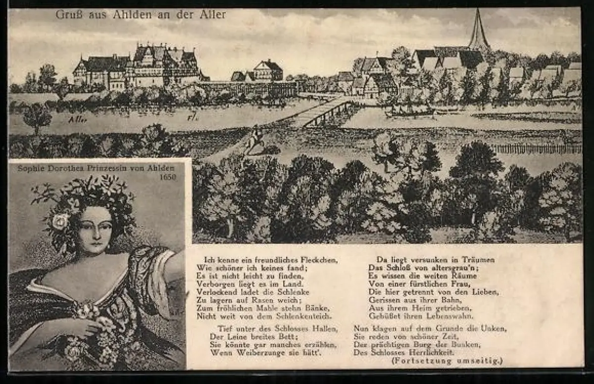 AK Ahlden a.d. Aller, Gesamtansicht, Porträt Sophie Dorothea Prinzessin von Ahlden
