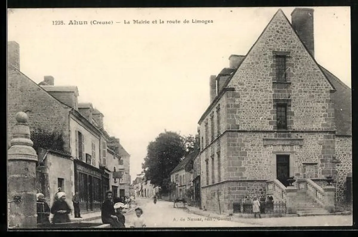 AK Ahun /Creuse, La Mairie et la route de Limoges